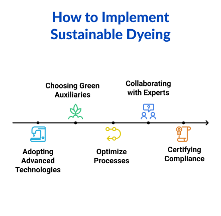 Transition to sustainable dyeing Eco-friendly practices need to be incorporated systematically into the dyeing process. Manufacturers can start by: