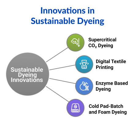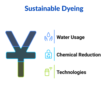A. Sustainable dyeing uses innovative methods like CO₂ dyeing, digital printing, and enzyme-based processes to cut water, chemical, and energy use in textile production.