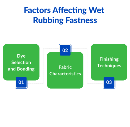 Finishing chemicals such as fixatives and silicone softeners increase wet rubbing fastness. Silicone softeners act as a protective layer to reduce friction, and cationic fixatives strengthen dye-fibre bonds.