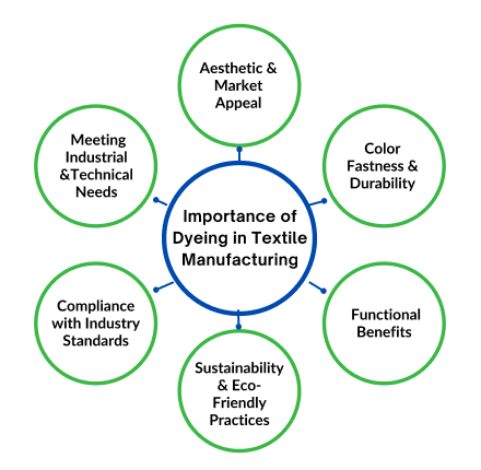 A. Dyeing improves the aesthetic value of fabrics, enhances durability, provides functional benefits (e.g., UV resistance, antibacterial properties), and ensures compliance with industry standards.