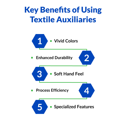 Textile auxiliaries deliver tangible benefits for fabric quality improvement and for production efficiency. They enable mills to produce textiles that can be worn, looked at, and feel luxurious the qualities associated with high-end products. For global markets textile auxiliaries add value such as stain resistance or anti-static properties making fabrics more attractive to buyers.